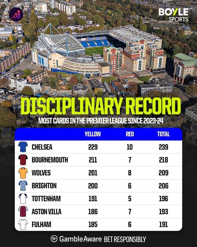 数据统计显示,切尔西是自23/24赛季以来在英超拿红黄牌最多的球队,共计239张。