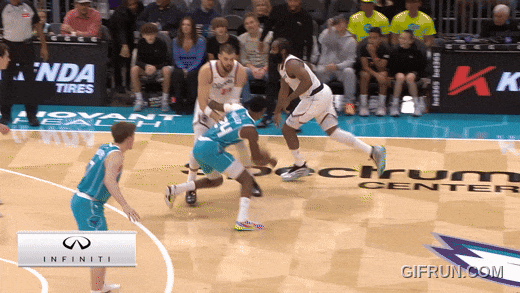 一个击地喂沃特森上篮,前因是接球不稳,拉文夹击,约基奇接球落地,转身击地,沃特森内切扣篮。